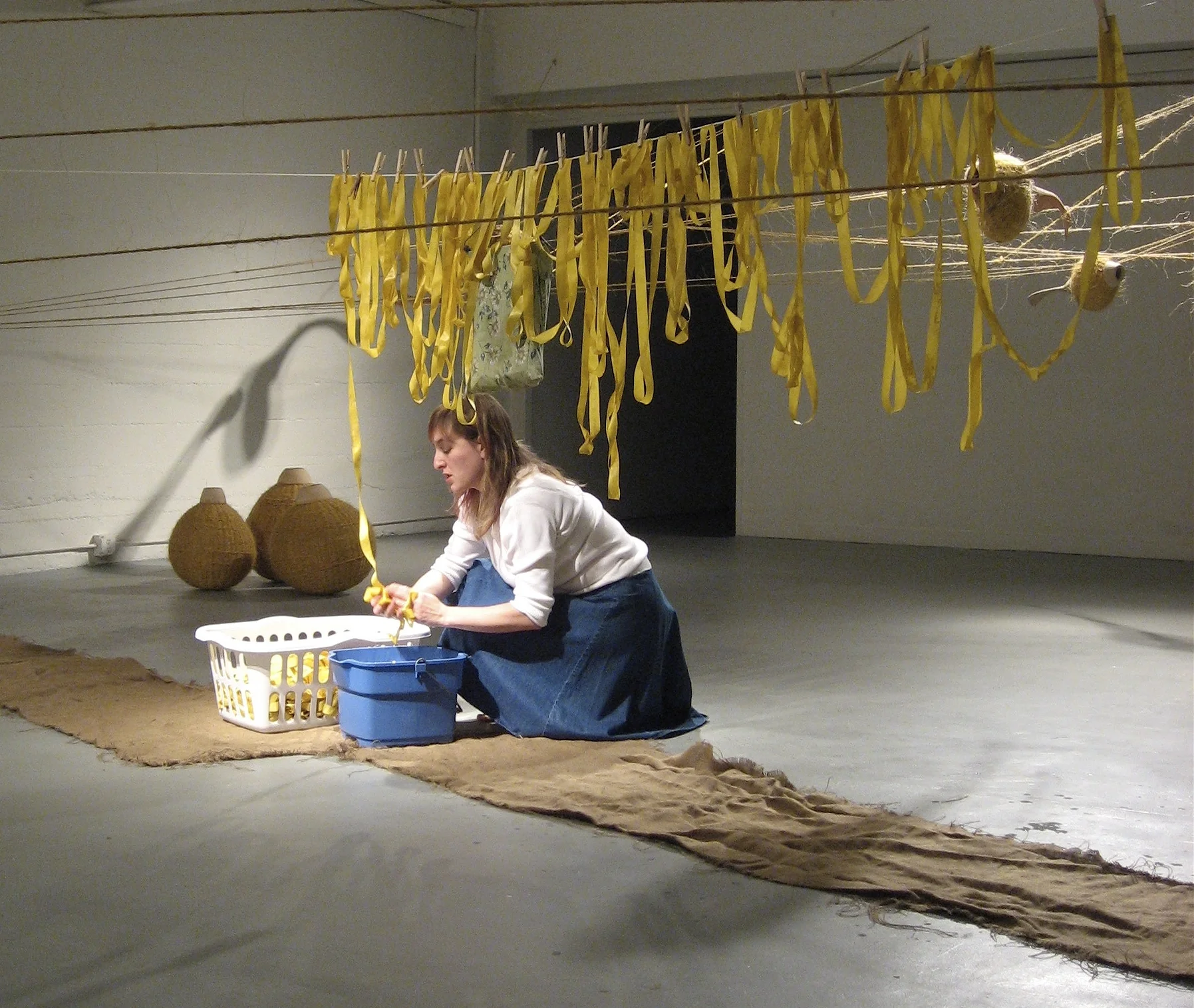 For this performance, I washed thousands of yards of dirty yellow ribbon I had wound on an enormous spool, then hung it to dry. While I washed the ribbon, I sang songs from the Spanish-American, Revolutionary and Civil War era. The songs reflected the futility of war from the perspectives of a soldier, a widow, and a mother of a soldier wounded in battle. The performance lasted three hours.